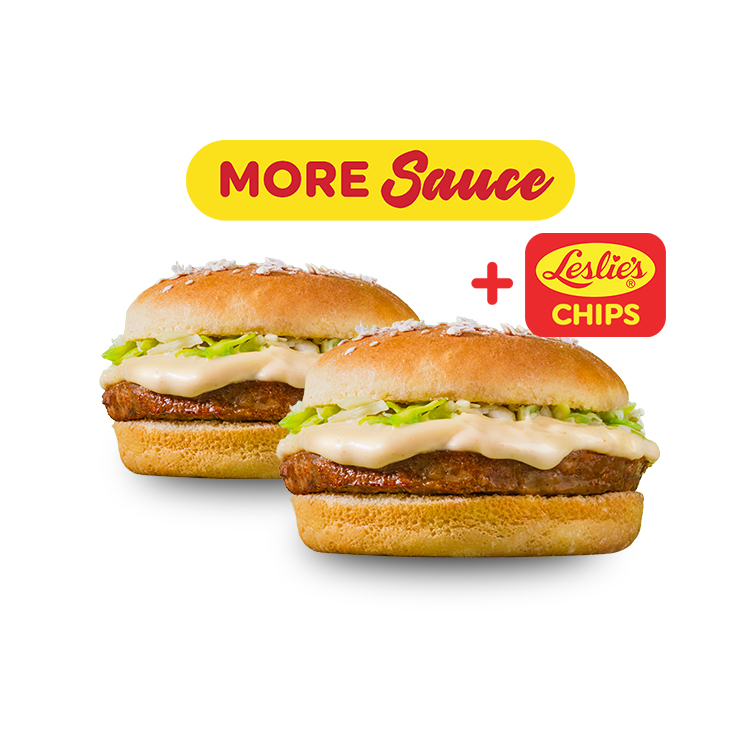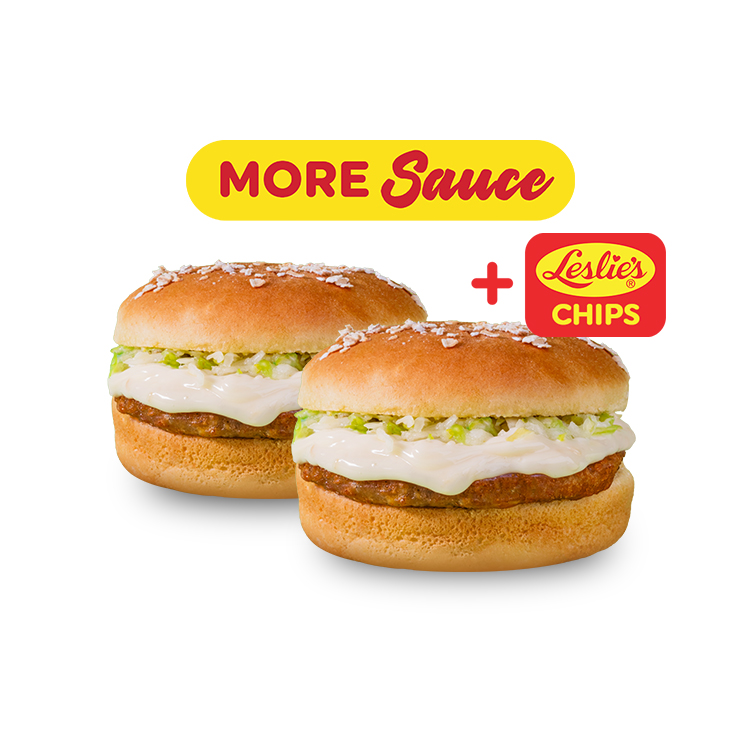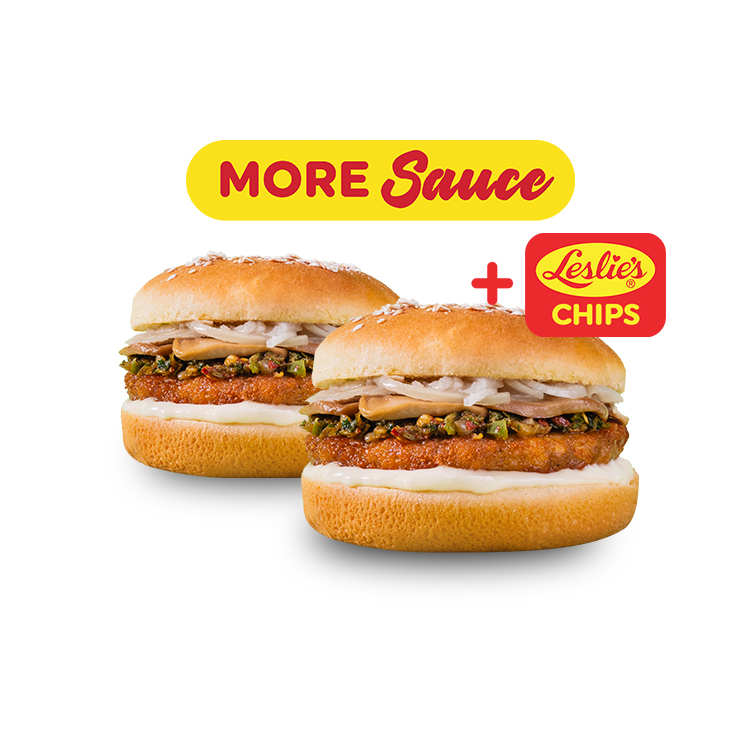 Buy 1 Take 1 50/50 Veggie Premium Chicken Burger + Leslie's Premium Chips (₱ 118)